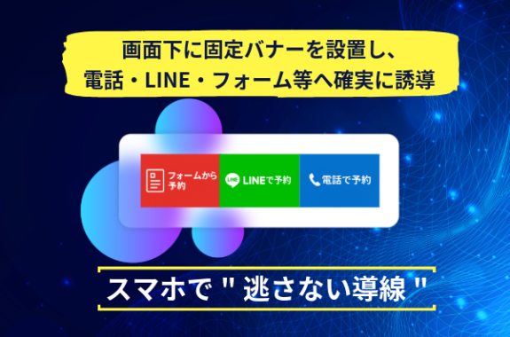 スマホで“逃さない導線”。画面下に固定バナーを設置し、電話・LINE・フォーム等へ確実に誘導。